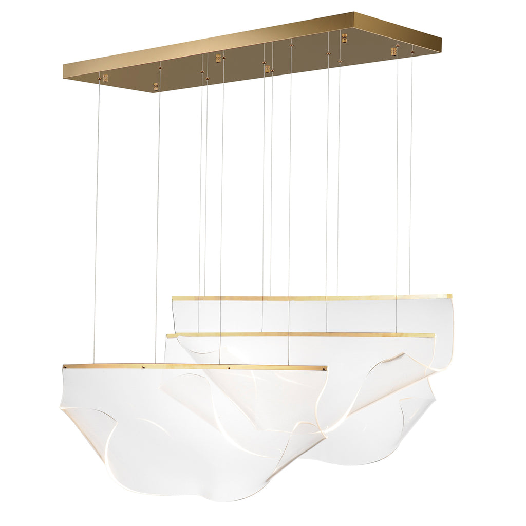 An airy arrangement of abstract forms, the Rinkle pendants feature sheets of transparent acrylic shaped by hand. The light guided acrylic captures the glow of energy efficient LEDs recessed within strips of shining stainless steel, obscuring the source of illumination. Delicately suspended by a series of thin wires, the pendants appear to be floating in an adjustable configuration of weightless light sculpture. Available in Polished Chrome, French Gold, and Brushed Gunmetal, its unique design adds a showstopping element to interior spaces.