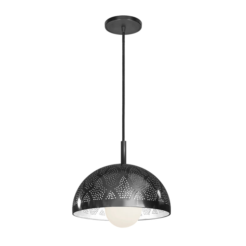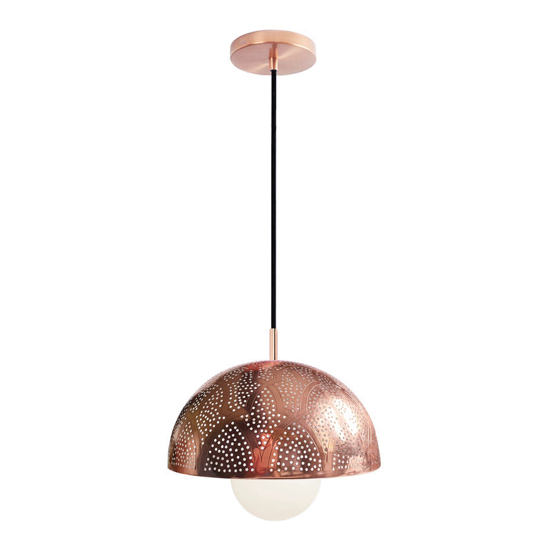 Zana is our modern Moroccan pendant light made from punched metal and pierced designs. The semi-sphere shape is modern with a hint of midcentury. It's handcrafted from brass, copper or nickel silver. The tiny holes create a stunning shadow pattern onto the walls while the wide mouth allows for the light to escape with ease, spreading fully into the space around it allowing the light to shine through for amazing warm ambient light. Full range dimming.