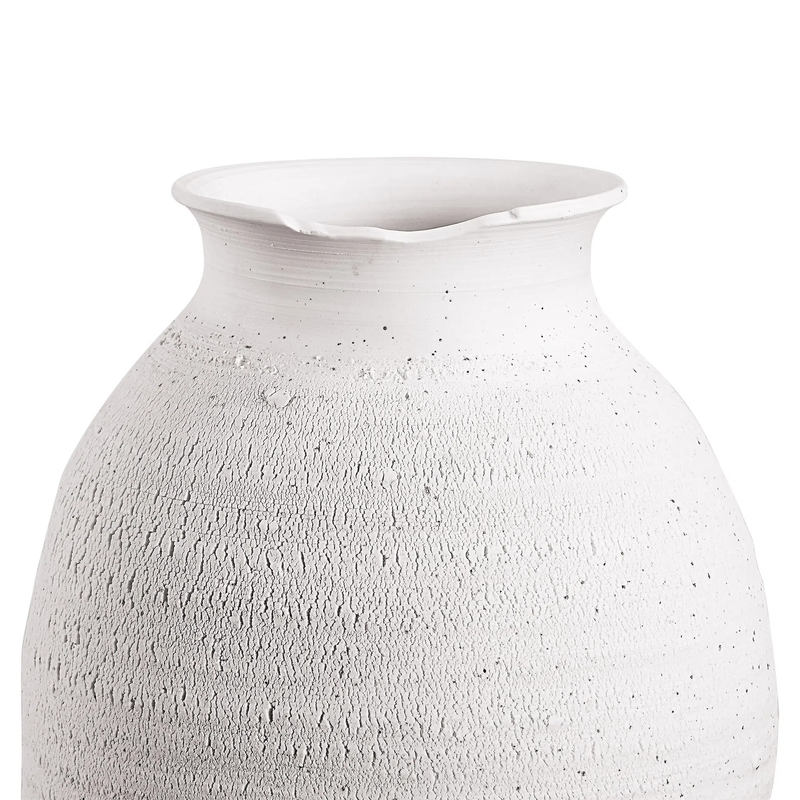Light casting highlights and shadows on this vase only make it more enchanting. The ceramic structure and matte white finish of this piece create a timeless quality that allows it to fit within a variety of interior styles. With a wide structure, this accessory allows for grand arrangements to be placed inside, from eucalyptus and willows to lavender and faux florals.